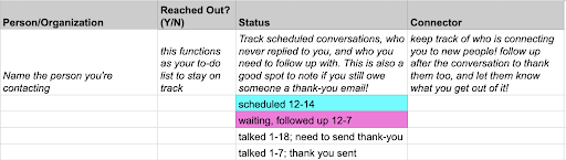 I keep my notes from calls in Google Drive, and this year I’ve started using a spreadsheet to track my conversations — including whether I’ve sent my post-conversation thank-you email. (Always send a thank you!)