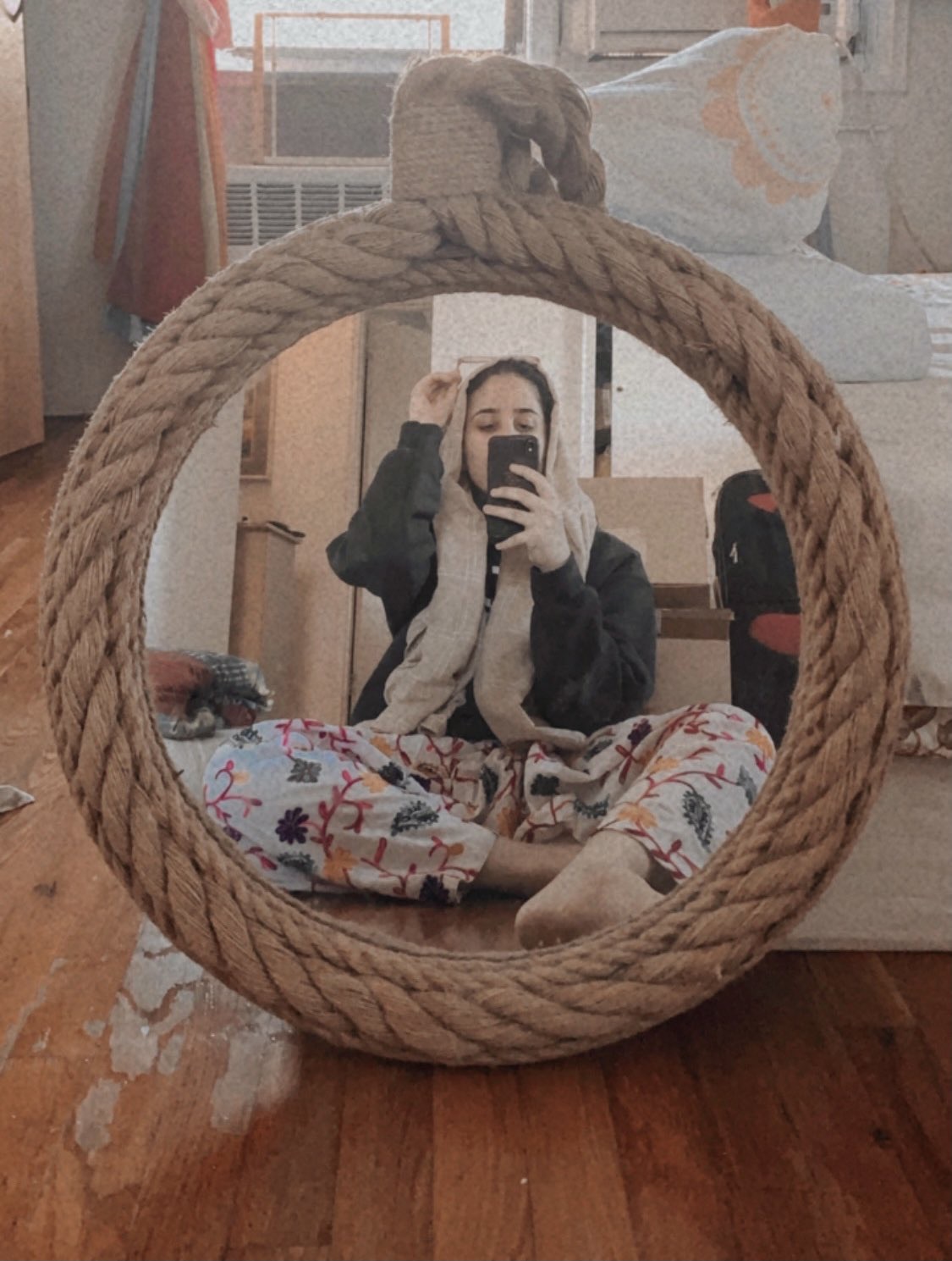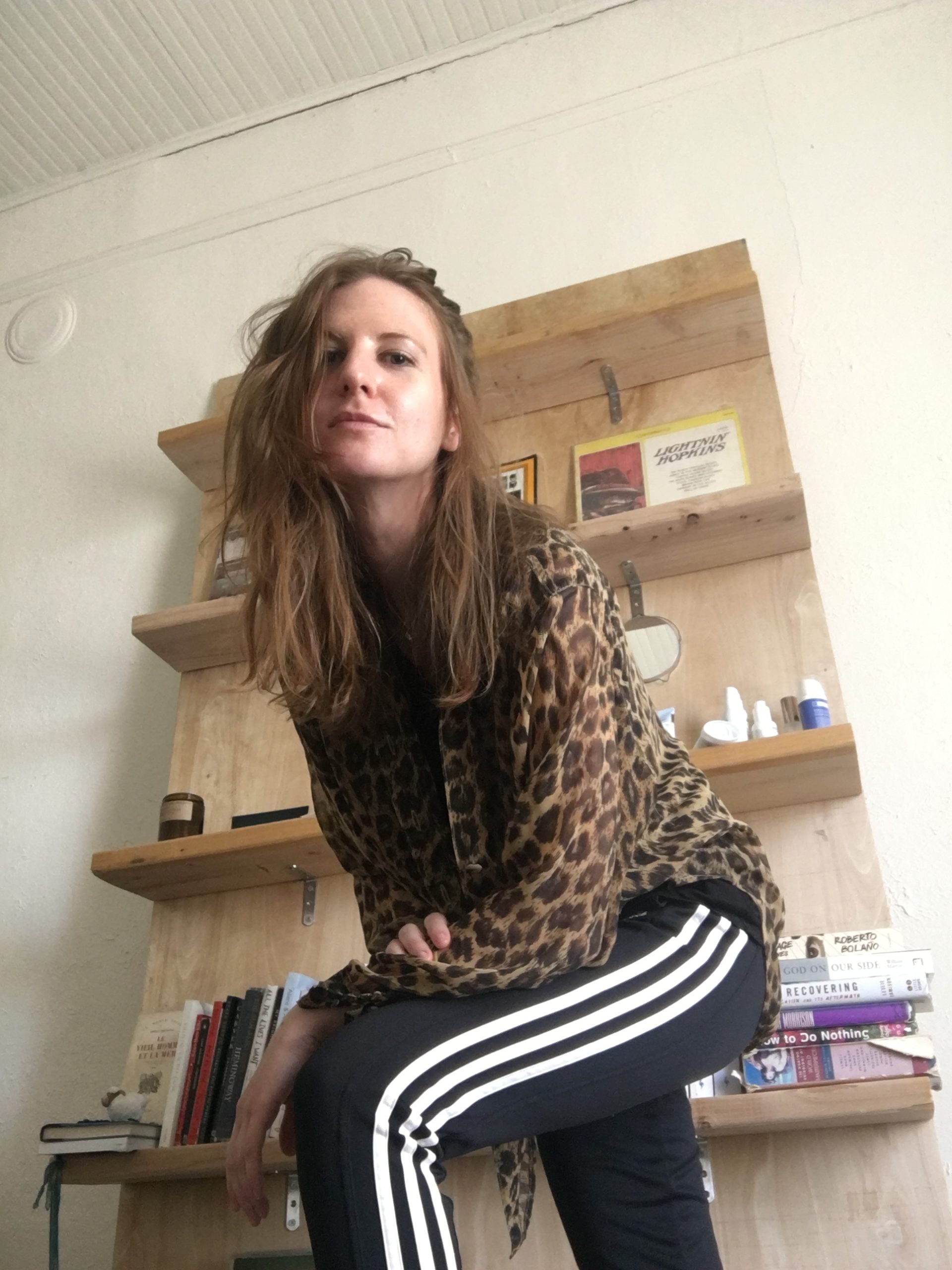 “Loose patterned button-downs have always been a wardrobe staple for me, but for some reason in quarantine I started pairing them with track pants?? When re-watching The Sopranos recently, I realized I had basically adopted the sartorial sensibility of Christopher Moltisanti. I’m now comfortable in my new identity. This is how I dress now. I usually pair this look with Converse but have also worn it with snakeskin boots, which should probably be illegal.”—Allegra Hobbs, Marfa, Texas-based staff writer for Study Hall