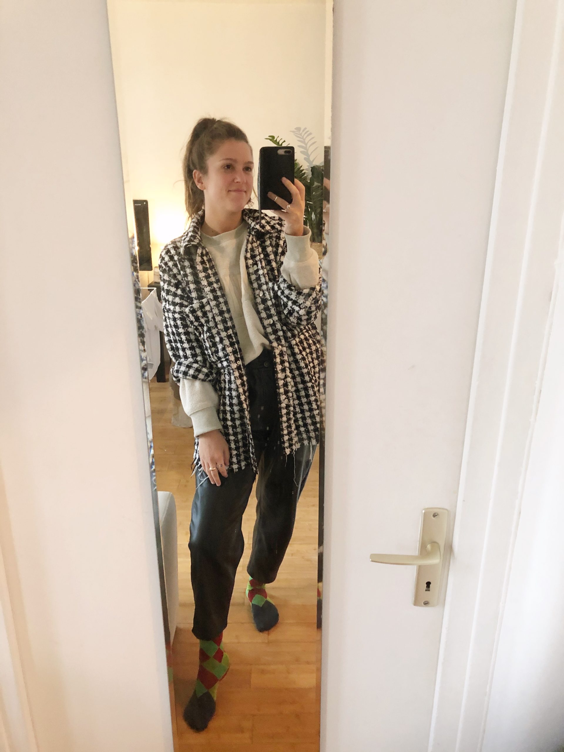 “Six months into working from home, I’ve graduated from sweatpants into elastic-waisted pleather pants, which are surprisingly comfortable for a wholly unbreathable fabric. Top portion consists of fuzzy (inside and out!) Levi’s sweatshirt which I have washed nearly never and a checkered lumberjack piece that allows me to work at all times with my windows fully open, despite almost daily rain.”—Gabrielle Pedriani, Paris-based publicist and occasional freelance writer