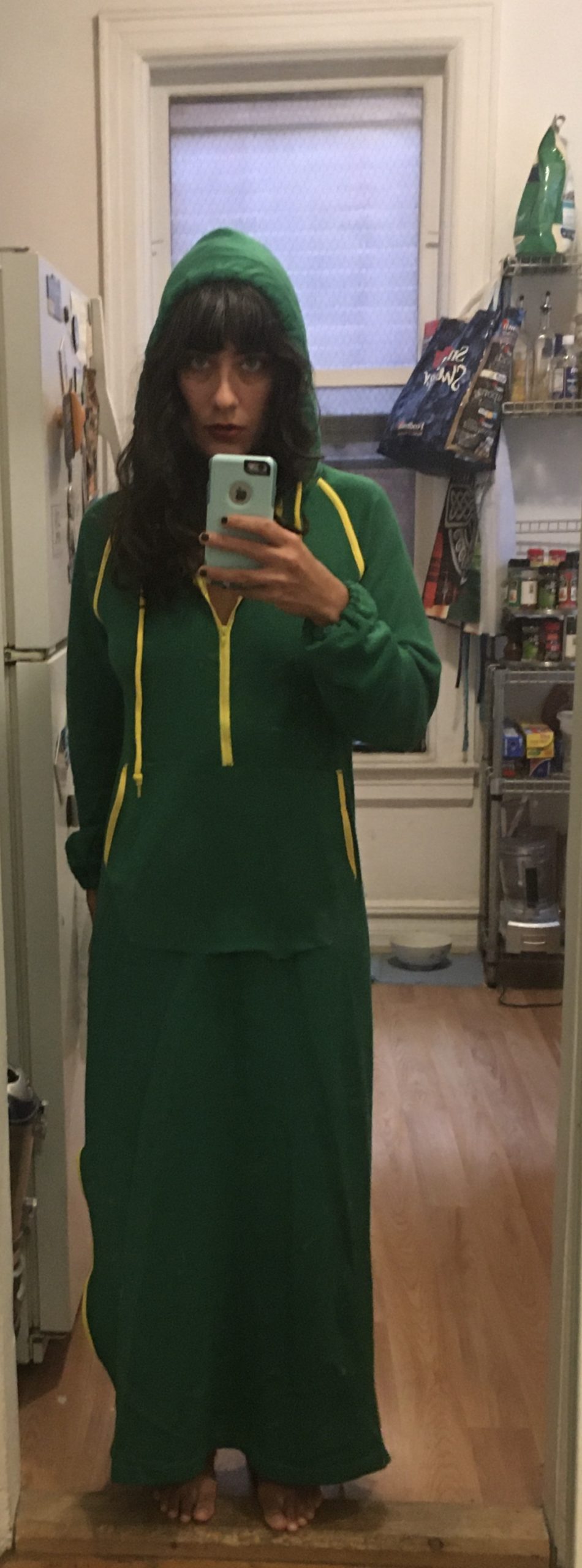 “I’m generally not thrilled when it gets colder out, but one small joy is that it’s chilly enough for me to wear this ’70s athleisure/house dress that belonged to my grandma. I really don’t understand what it is, but it’s thick and comfy and makes me feel like a strange gnome. I usually don’t wear it outside of the house except maybe to walk the dog, although I did put it on, with several layers under and over, for a blizzard Rockaway beach day back in January (oh, we were so young then!).” — Kate Mooney, Brooklyn-based freelance writer and author of this article 🙂