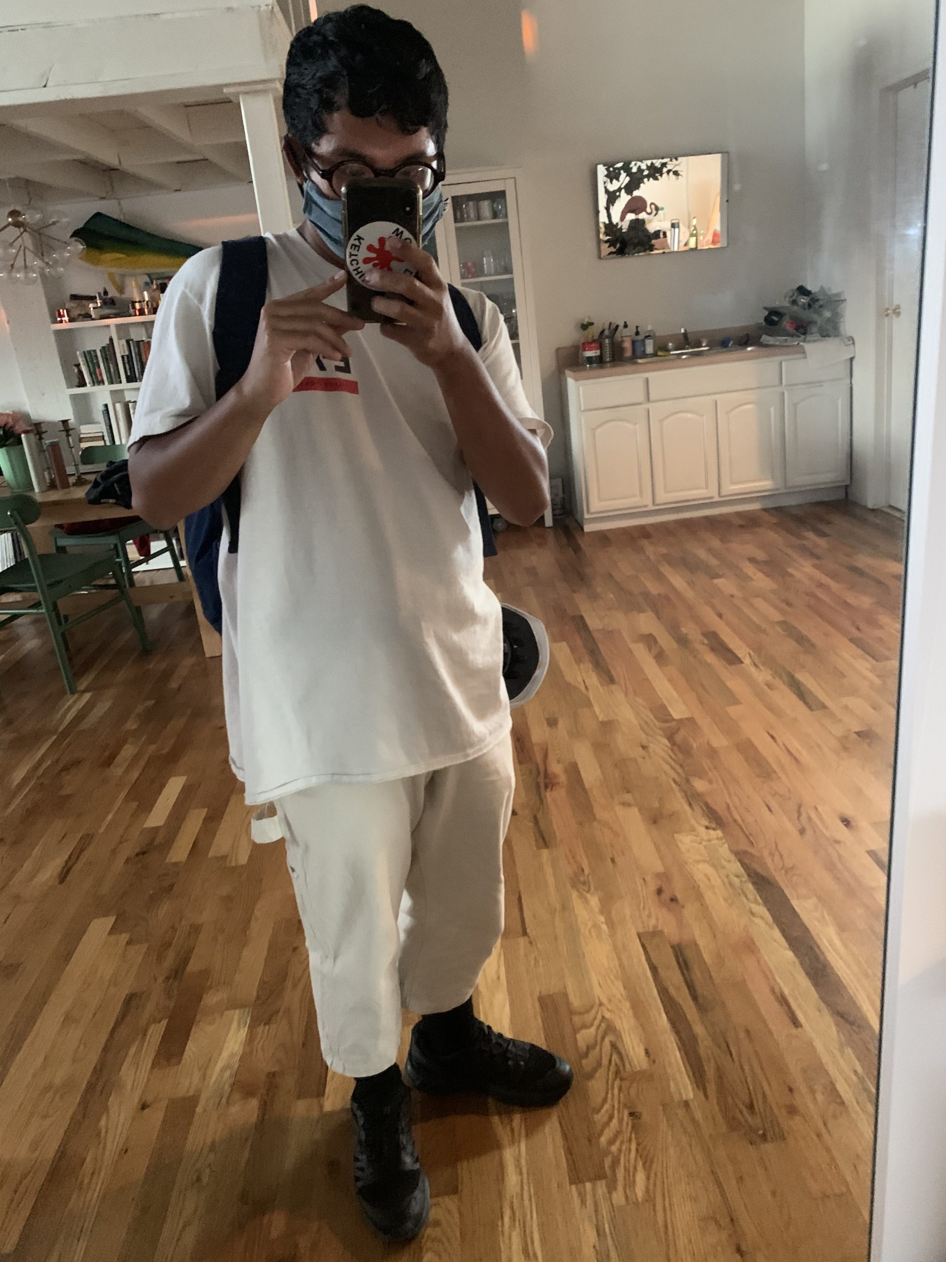 “It’s comfy and roomy, and an all white fit is a flattering even as it gets dirty. The shoes are Salomons, which strike me as the perfect in-between of a house shoe (they are slip on) and a walking-around shoe. I have a 69 US denim mask, which are very breathable.” — Kevin Lozano, Brooklyn-based writer, editor, and Diversity Hire podcaster