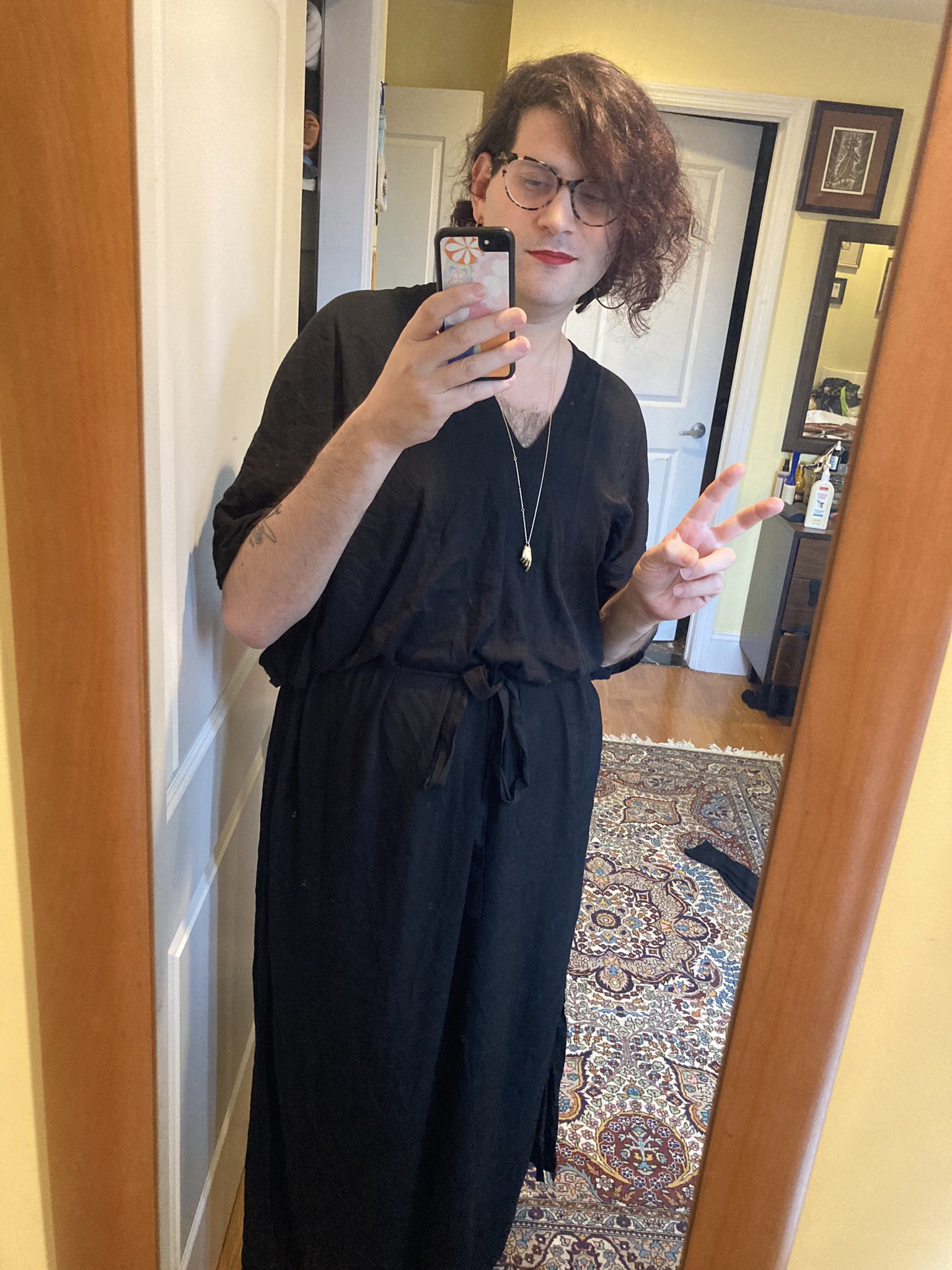 “I’ve basically worn this caftan I found on Etsy every day since I’ve gotten it. I already worked from home the last few years, but my desire to put on clothes has just absolutely plummeted so this shapeless bag is the best I’m gonna do. If I have to do a call or something, I will pop on some lipstick maybe and put on earrings. Luckily, from the waist up this thing looks enough like a black top or something, though I guess my ~secret~ is out now.” — Matt Lubchansky, Queens-based freelance cartoonist and editor