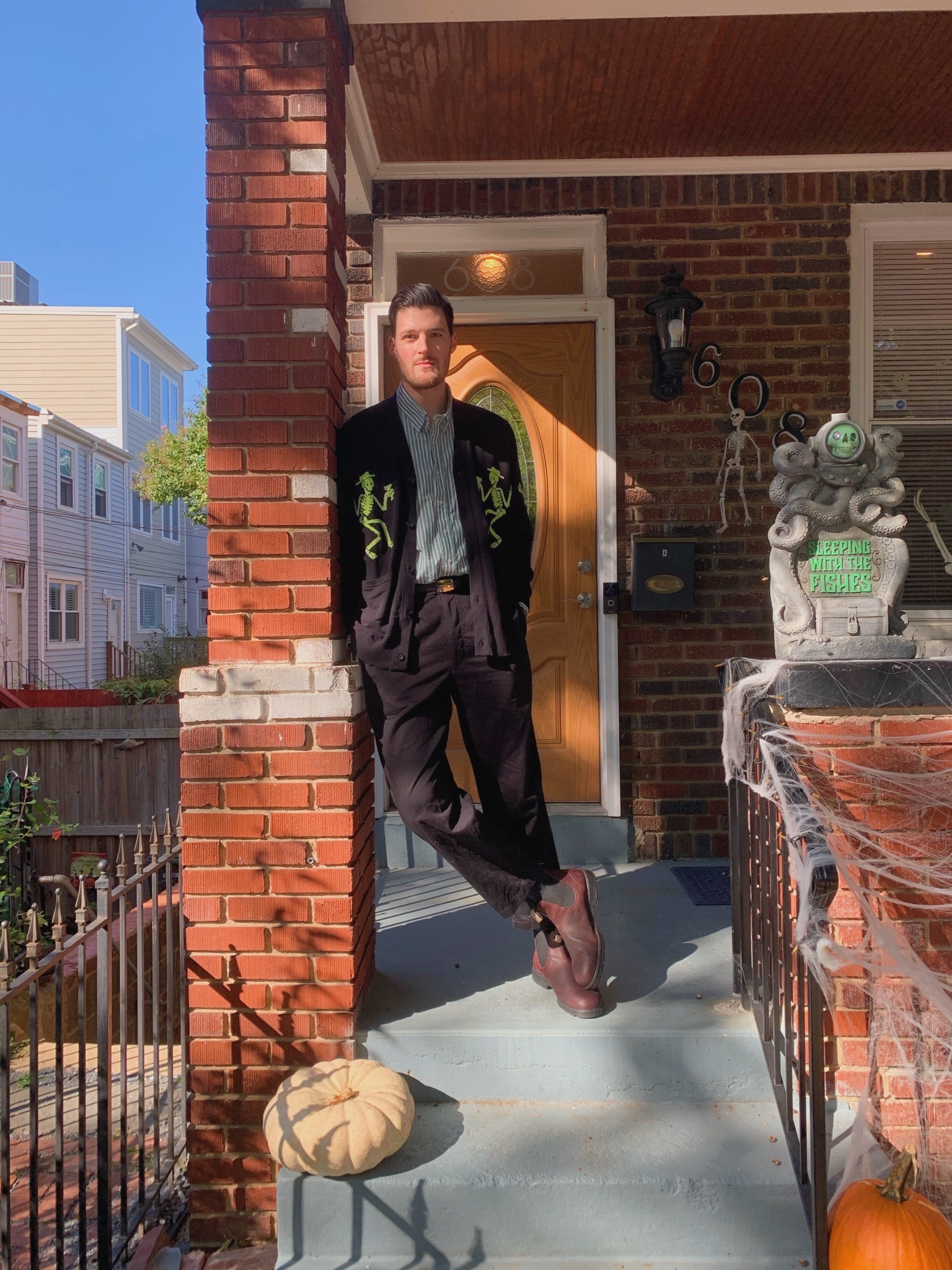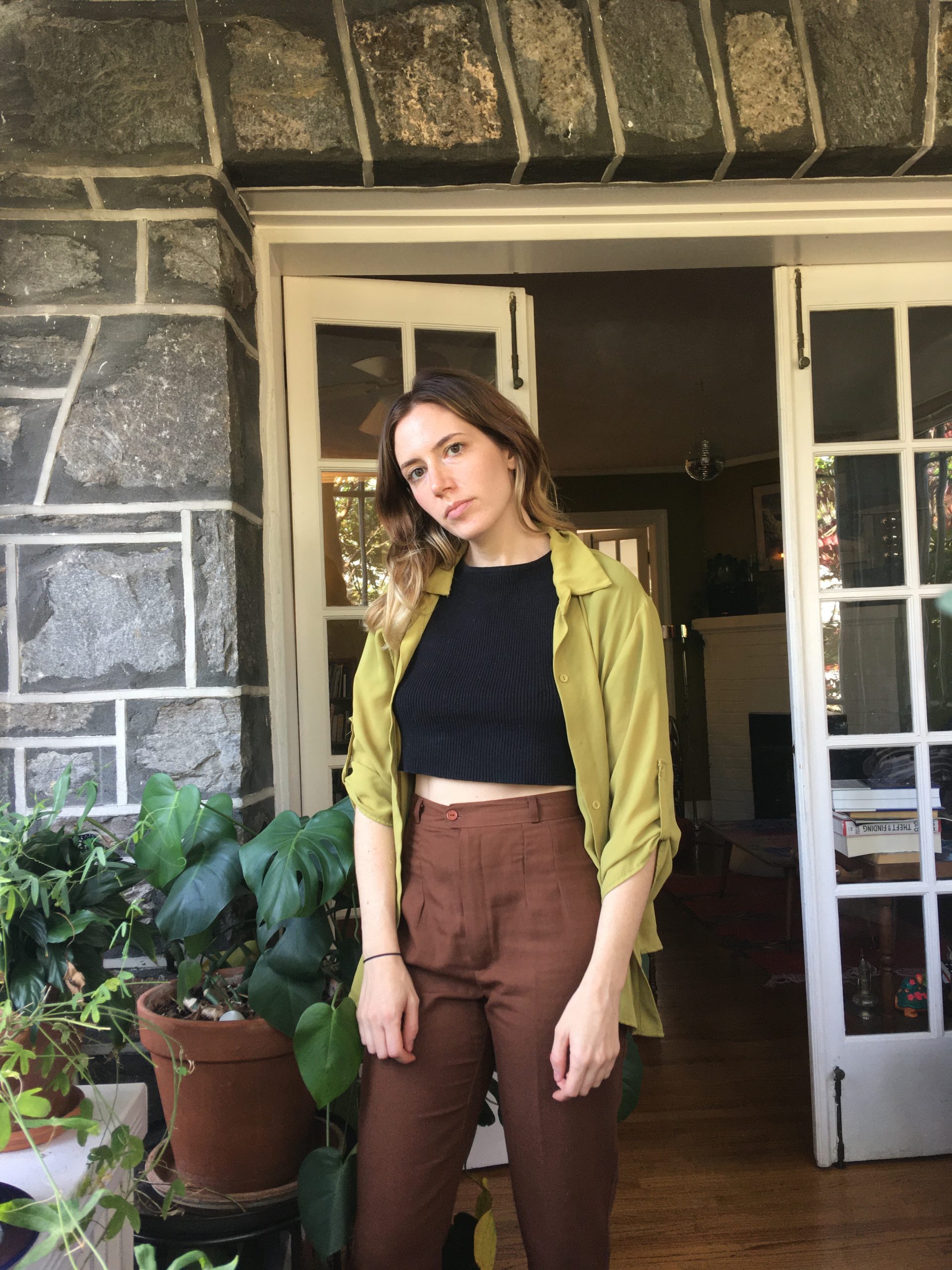 “I work one day a week at my friend’s vintage shop. I normally resist buying stuff on my shift, but a couple weeks ago, I caved and bought these brown trousers. I like wearing them because they’re a new addition to my closet and, after seven months in quarantine, I’m craving any kind of novelty in my life. I’ve also been into the black/brown color combo lately, which I thought was just a consequence of fall, but then I realized I’ve been accidentally dressing to match my black/brown dog, Sweet Potato.” — Nora Belblidia, Baltimore-based freelance writer