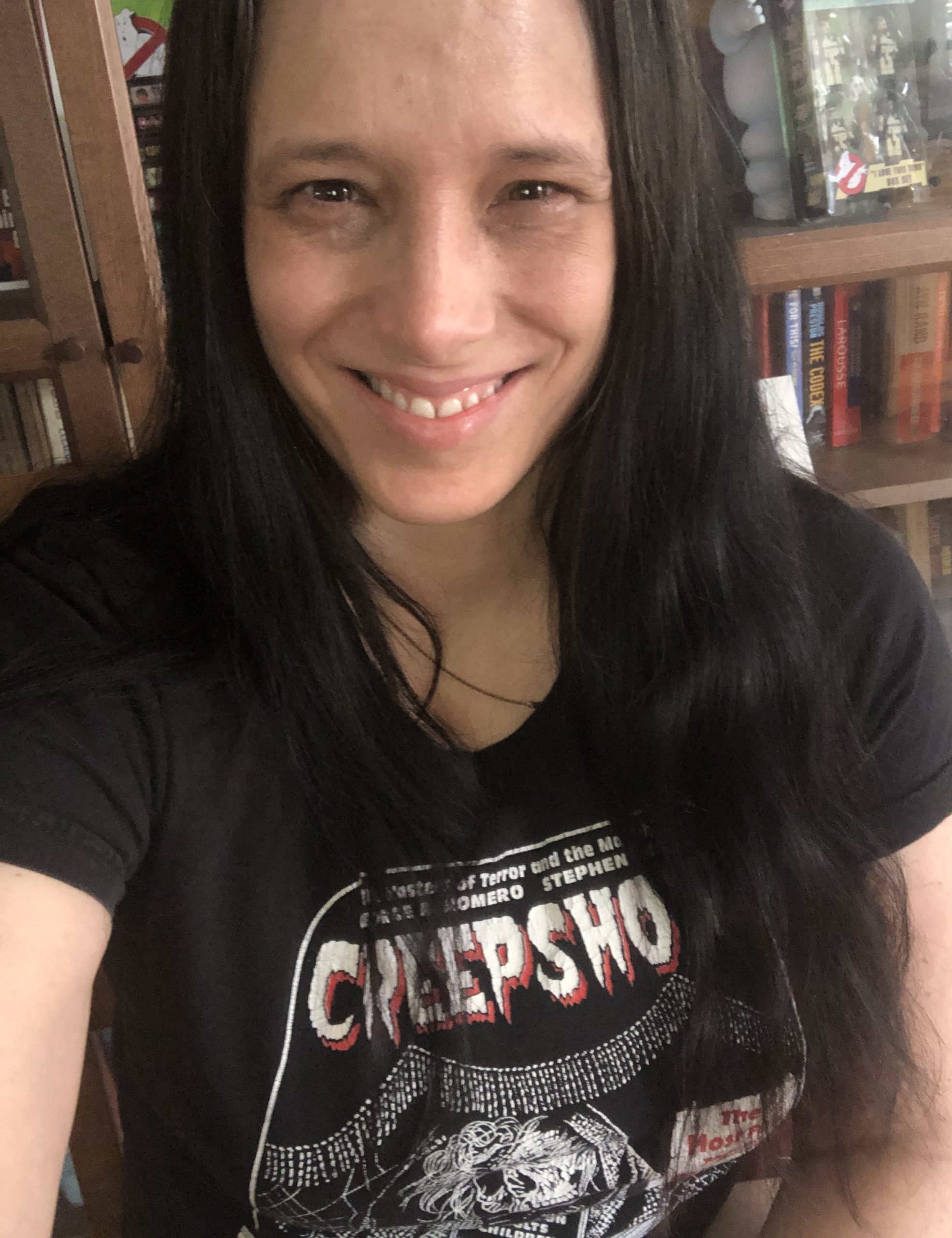 “I like to wear a comfortable horror T-shirt and baggy yoga pants, or black pajamas shorts. I hardly leave the house so I need to wear something that I can relax in.” — Tiffany Aleman, LA-based horror journalist/film critic/satirist