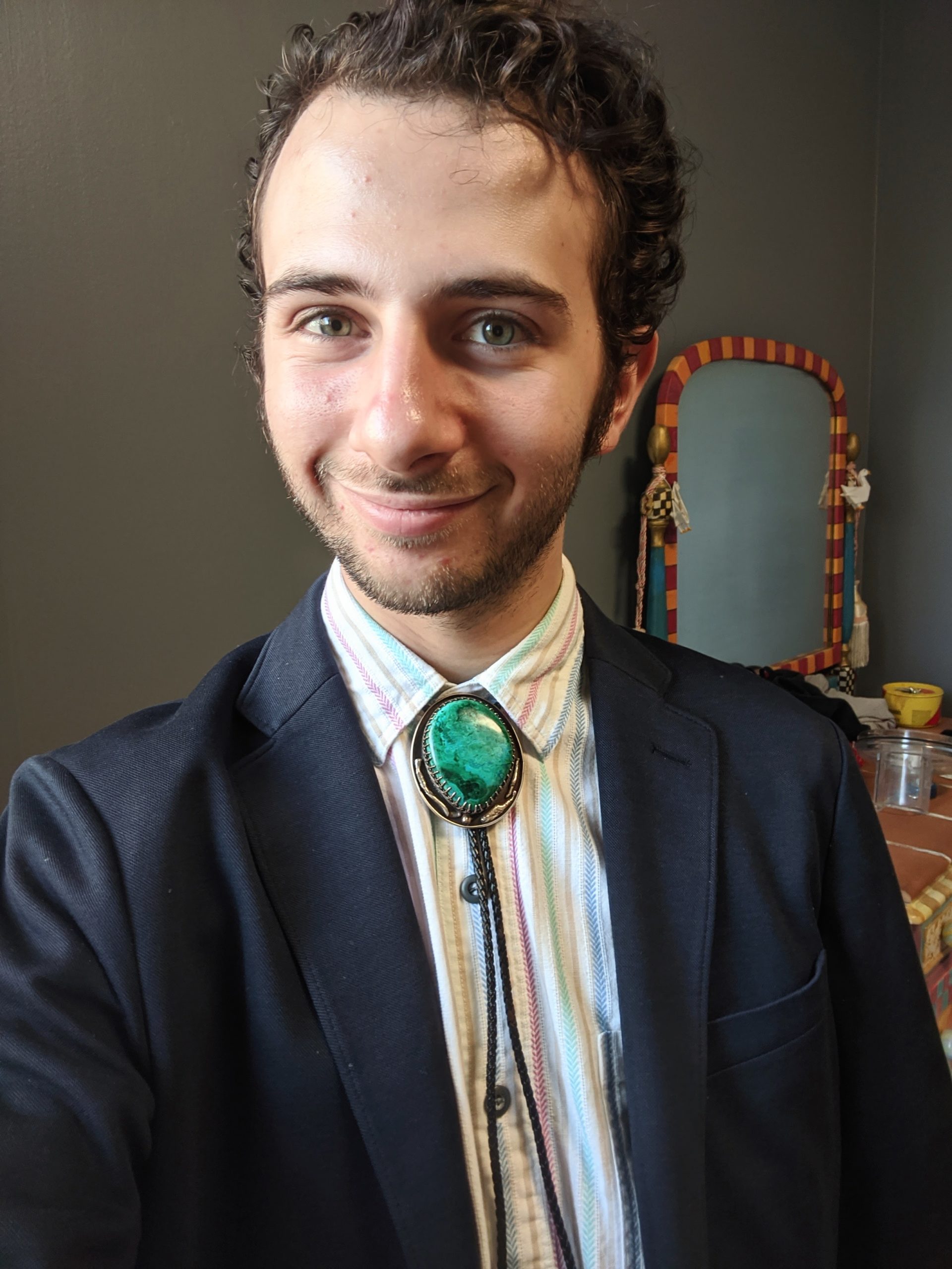 “My PR job is my first job since graduating college, so even though I work from home, I’m trying to dress up to show my coworkers that I’m taking the position seriously. Today, I have my first article on bolo ties coming out in MEL Magazine, so I thought I’d wear one bolo from my collection to celebrate. It’s a chrysocolla bolo with Hogan-style tips.”—Pearse Anderson, Chicago-based press strategist and freelance journalist