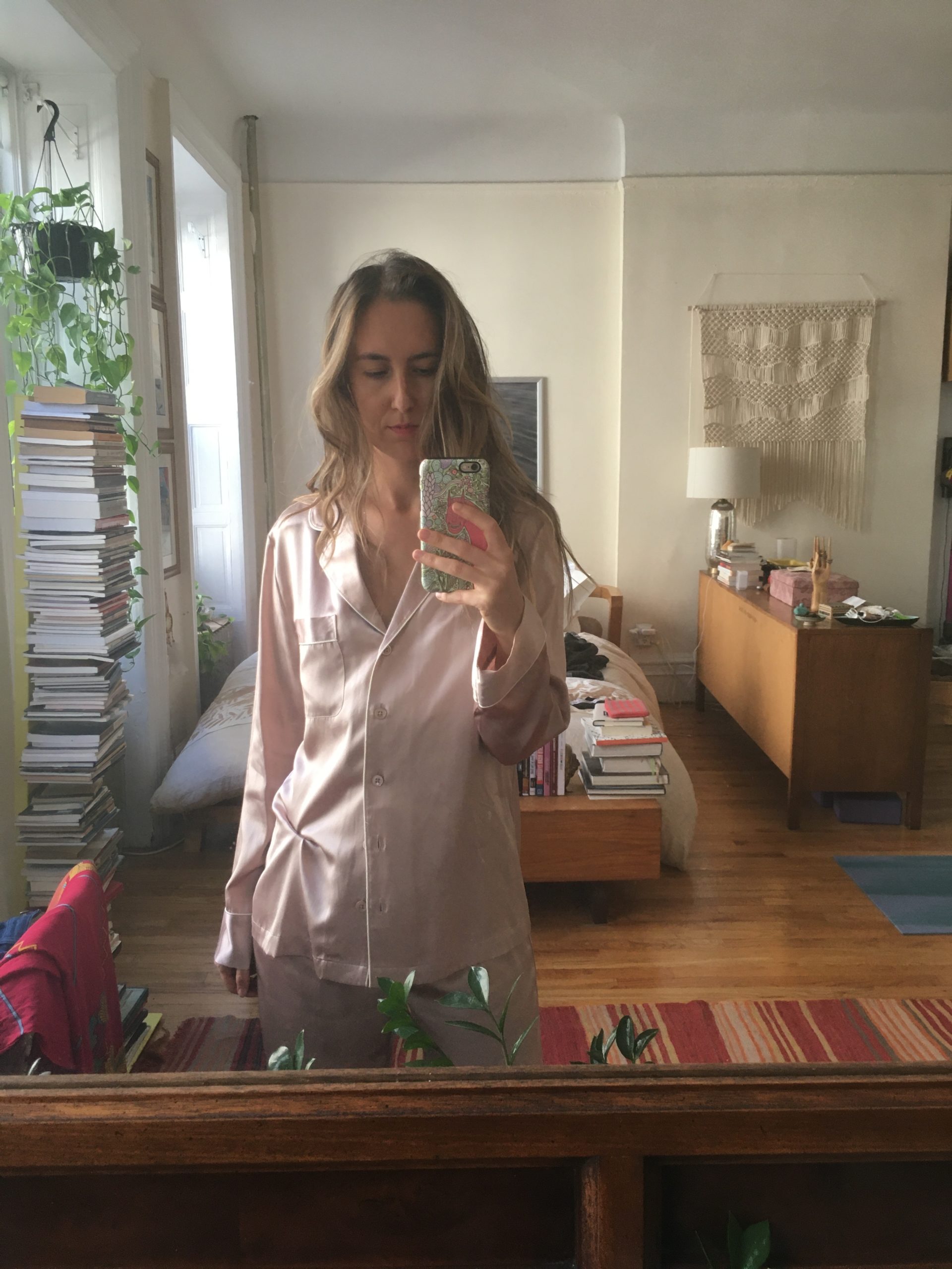 “At the beginning of the pandemic, I bought a set of secondhand silk pajamas on Etsy. They are the perfect pig’s ear pink with cream-colored piping. Many mornings I don’t want to face the ugly world and its requirements, so I stay in my pajama set, which elevates my lingering to something like a lifestyle.”—Carina del Valle Schorske, Manhattan-based freelance writer and translator