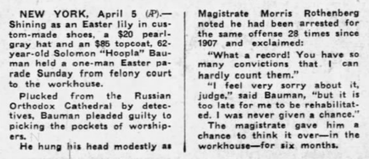 The great victory of Hoopla Bauman’s life is that he never stopped picking pockets, and the police did not seem especially invested in preventing him from doing so. Early in his career, he was threatened with 15 years to life in prison under a mandatory minimums law, but a judge waived the charge: he said that his conscience wouldn’t allow him to hand down a sentence that harsh, and that it wouldn’t serve society. Bauman went on doing petty theft, serving a few months in jail, and rattling off one-liners to crime reporters at the Daily News and the Brooklyn Daily Eagle, again and again, for the next twenty years.