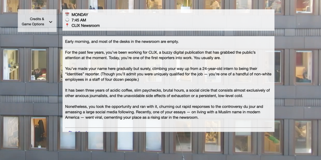 Off the Record is an interactive narrative written by Farah Mohammed and designed and coded by Mary Truong about the daily experience of working as a journalist of color. You can find controls (save, rewind, and restart) on the sidebar, and once you get to the end of the narrative, you can also restart. The sidebar also includes links to resources for journalists of color and guidelines for inclusive journalism.